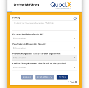 Die Quod.X®-Methodik versteht sich nicht als eignungsdiagnostisches Instrument, sieht sich aber den Grundzügen der DIN 33430 für psychologische Testverfahren verpflichtet. Demnach erfahren die Ergebnisse der Datenerhebung erst im Auswertungsgespräch jene praxisrelevante Klärung und Vertiefung, die für Ihre Führungstätigkeit von konkretem Nutzen sein kann.