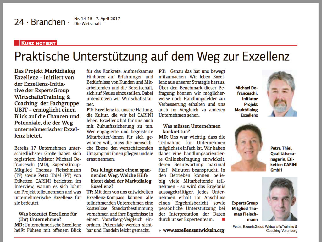 27. März 2017 – Presse: Praktische Unterstützung auf dem Weg zur Exzellenz – Weiterer Beitrag zum Projekt Marktdialog Exzellenz auf der Online-Plattform Wirtschaftszeit.at