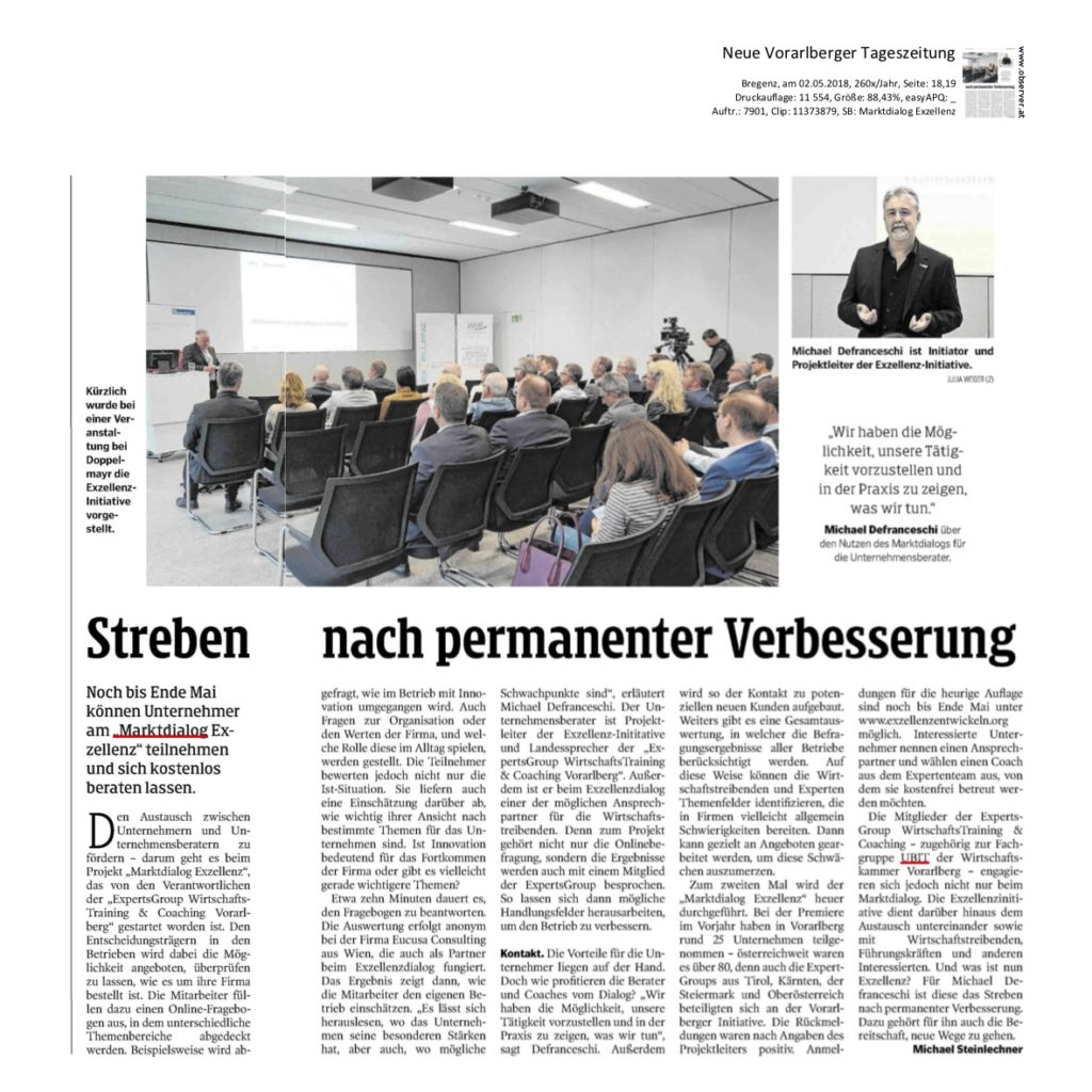 2. Mai 2018 – Presse: Streben nach permanenter Verbesserung. Interview zum Thema Exzellenzinitiative in der Neuen Vorarlberger Tageszeitung vom 2. Mai 2018, S. 18-19