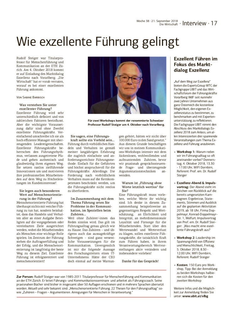 21. September 2018 – Presse: Wie exzellente Führung gelingt. Interview mit dem Gastreferenten Prof. em. Dr. Rudolf Steiger (ETH Zürich) im Rahmen unserer Veranstaltungsreihe Auf dem Weg zur Exzellenz in Die Wirtschaft, Woche 38 vom 21. September 2018, S. 17