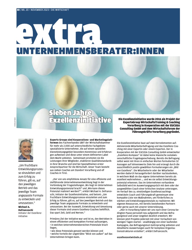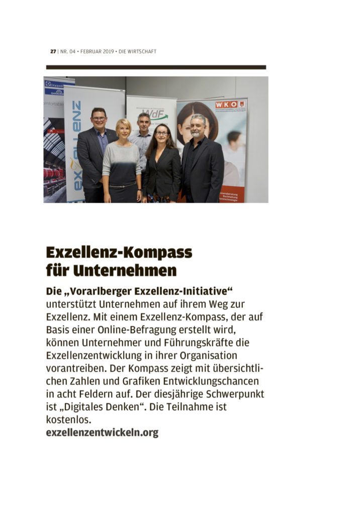 22. Februar 2019 – Presse: „Exzellenz-Kompass für Unternehmen!“ – Bericht in Die Wirtschaft, Nr. 04, Februar 2019, S. 27