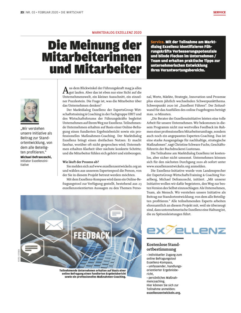 7. Februar 2020 – Presse: Die Meinung der Mitarbeiterinnen und Mitarbeiter. Vorstellung des Markdialog Exzellenz 2020 in Die Wirtschaft, Nr. 03 vom 7. Februar 2020, S. 23