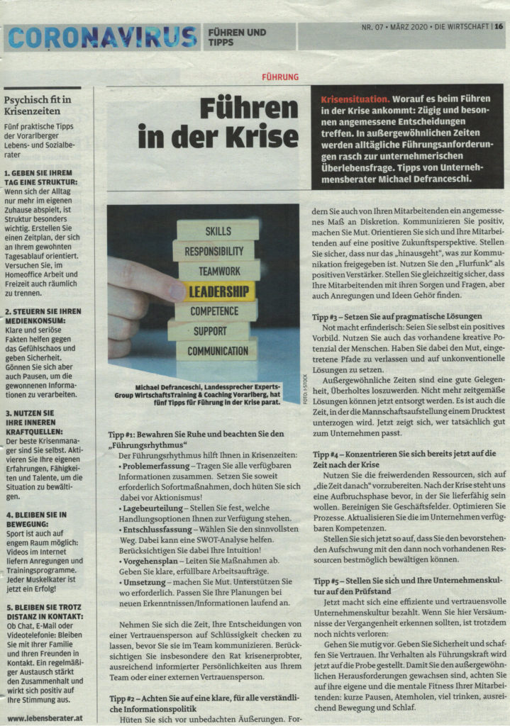 27. März 2020 – Presse: Führen in der Krise. In Die Wirtschaft, Nr. 07 vom 27. März 2020, S. 16