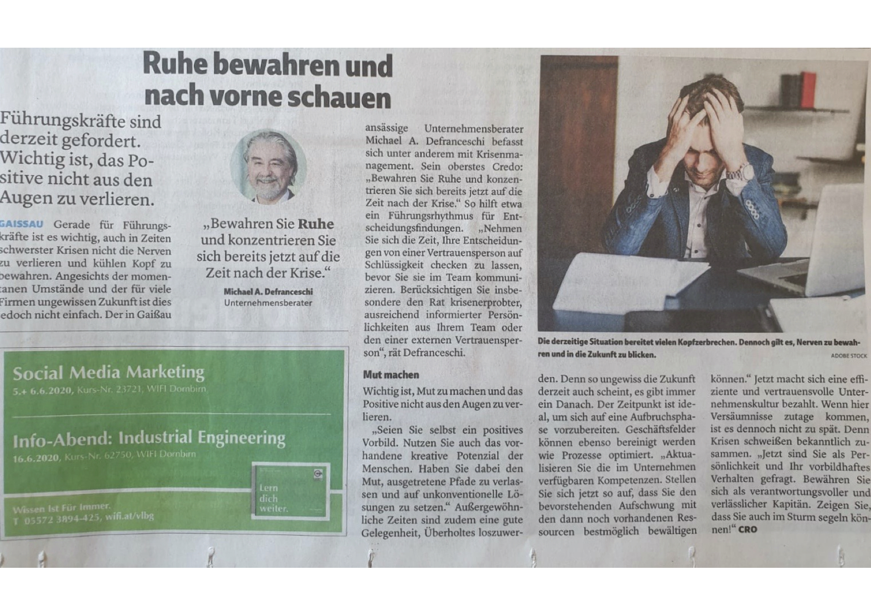 9. Mai 2020 – Presse: Ruhe bewahren und nach vorne schauen. Beitrag im Karriereteil E1 der Vorarlberger Nachrichten.