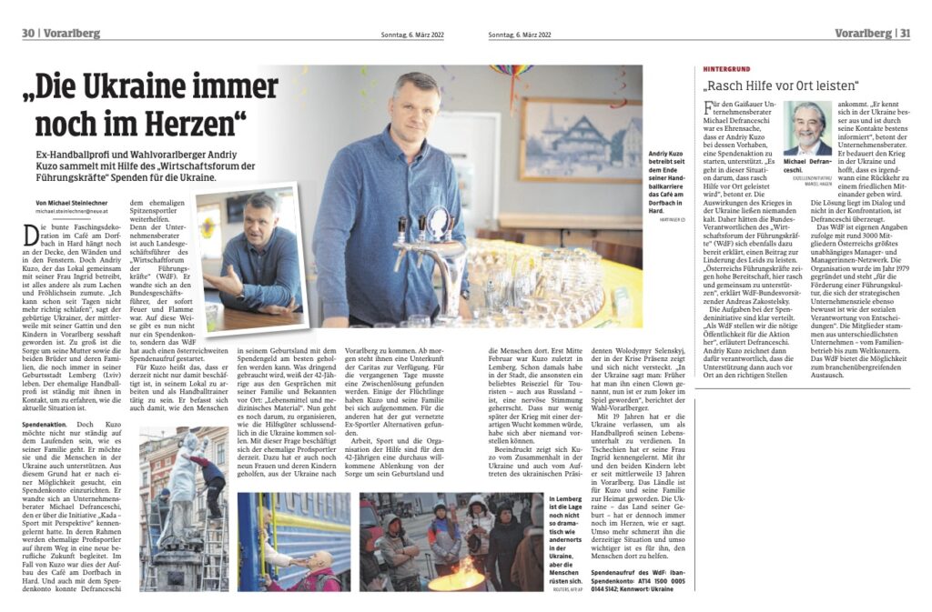 6. März 2022 – Presse: Die Ukraine immer noch im Herzen. Bericht über die gemeinsam mit Andrij Kuzo initiierte Ukraine-Hilfsaktion des WdF – Wirtschaftsforum der Führungskräfte. In NEUE Vorarlberger Tageszeitung vom 6.3.2022, S.30f