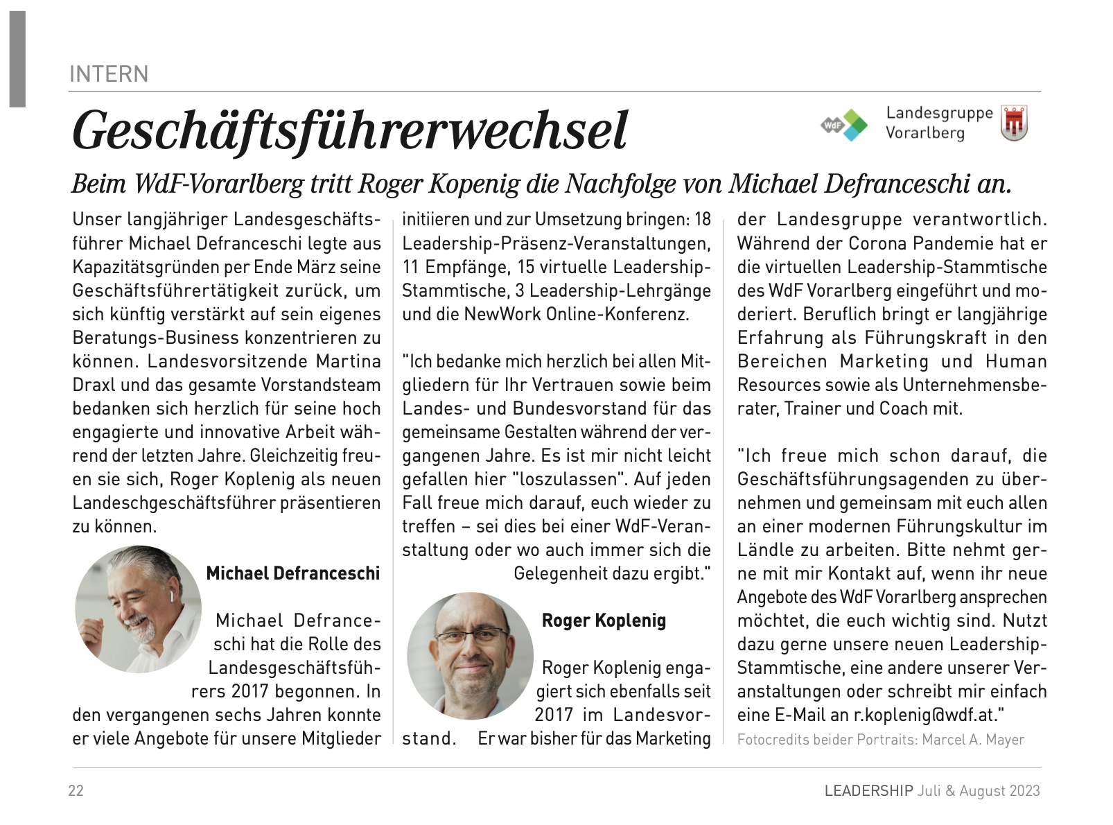Juli/August 2023 – Presse: Geschäftsführerwechsel. Nach 6 Jahren gebe ich aus Kapazitätsgründen die Geschäftsführung der Vorarlberger Landesgruppe des Wirtschaftsforums der Führungskräfte an meinen Kollegen Betr. oec. Roger Koplenig ab, LEADERSHIP – Ausgabe 07/08 2023, S.22